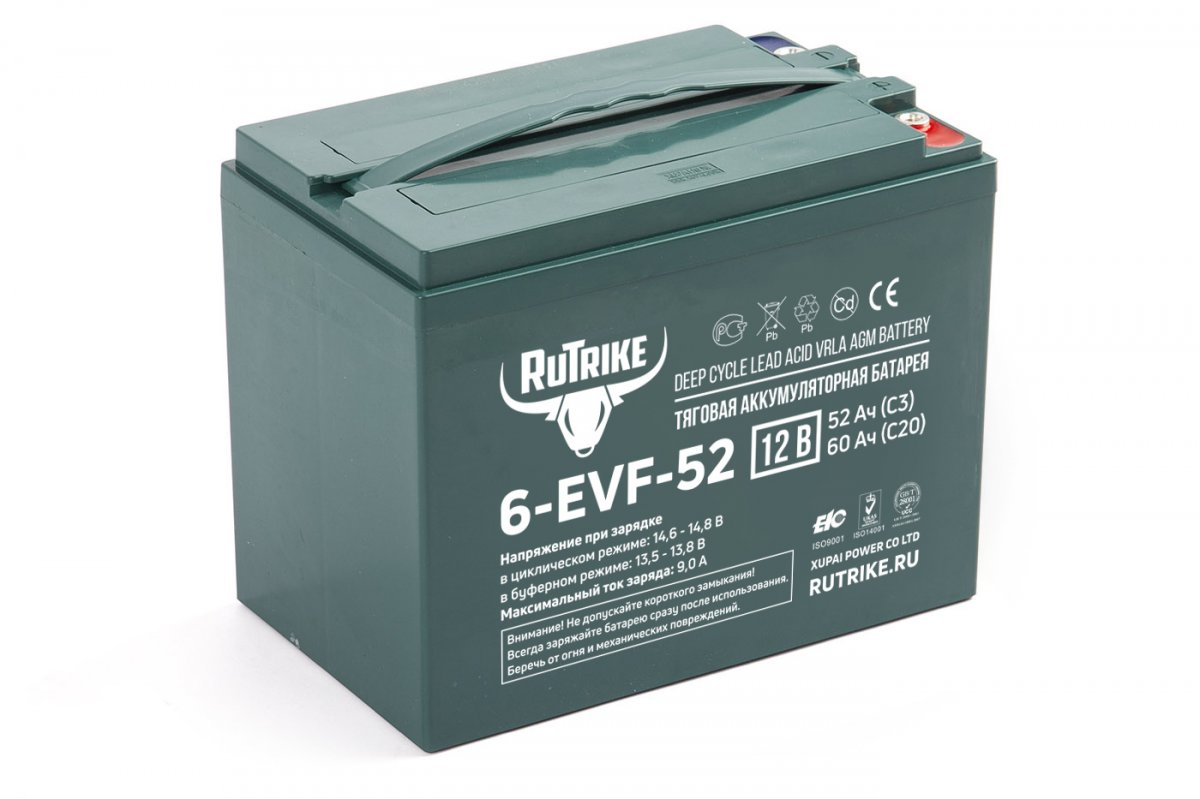Rutrike 6-EVF-52 - необслуживаемая аккумуляторная батарея с системой рекомбинации газов (VRLA) произведенная по технологии AGM. Батареи выполнены по технологии внутреннего формования. В свинцовых пластинах, имеющих большую толщину по сравнению со стандартными аккумуляторами, используется экологичный запатентованный сплав без кадмия и мышьяка. Плотный сепаратор из углеволокна пропитан электролитом, изготовленным по технологии NANO GEL. Электролит находится в сгущенном состоянии, не даёт утечек и не требует долива воды на протяжении всего срока эксплуатации.