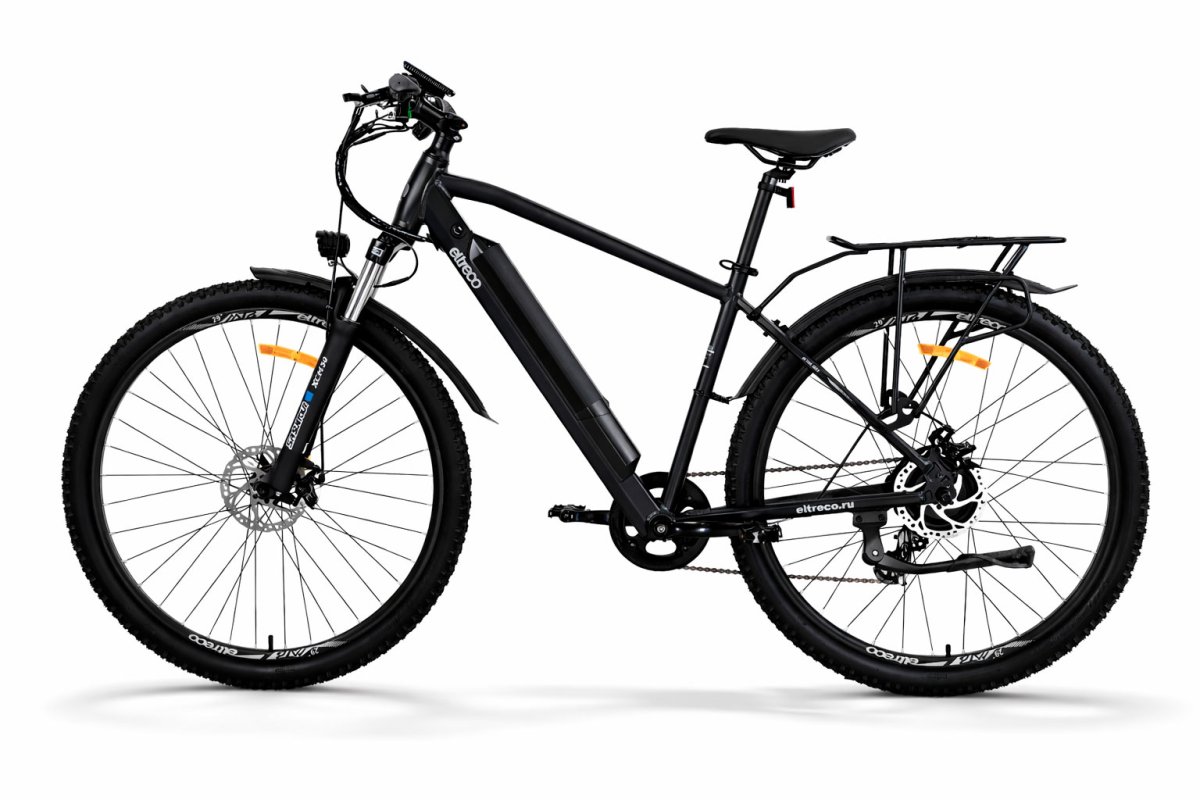 У новой модели от Eltreco лёгкая алюминиевая рама с интегрированной съёмной батареей (улучшенная развесовка по сравнению со старой моделью), большие колёса 29" и покрышки Kenda с универсальным протектором, 21 скорость от Shimano, пружинно-эластомерные амортизационная вилка с блокировкой, надёжный электромотор 350 Ватт и аккумуляторная батарея на 12 Ач, позволяющая преодолевать большие расстояния без подзарядки!