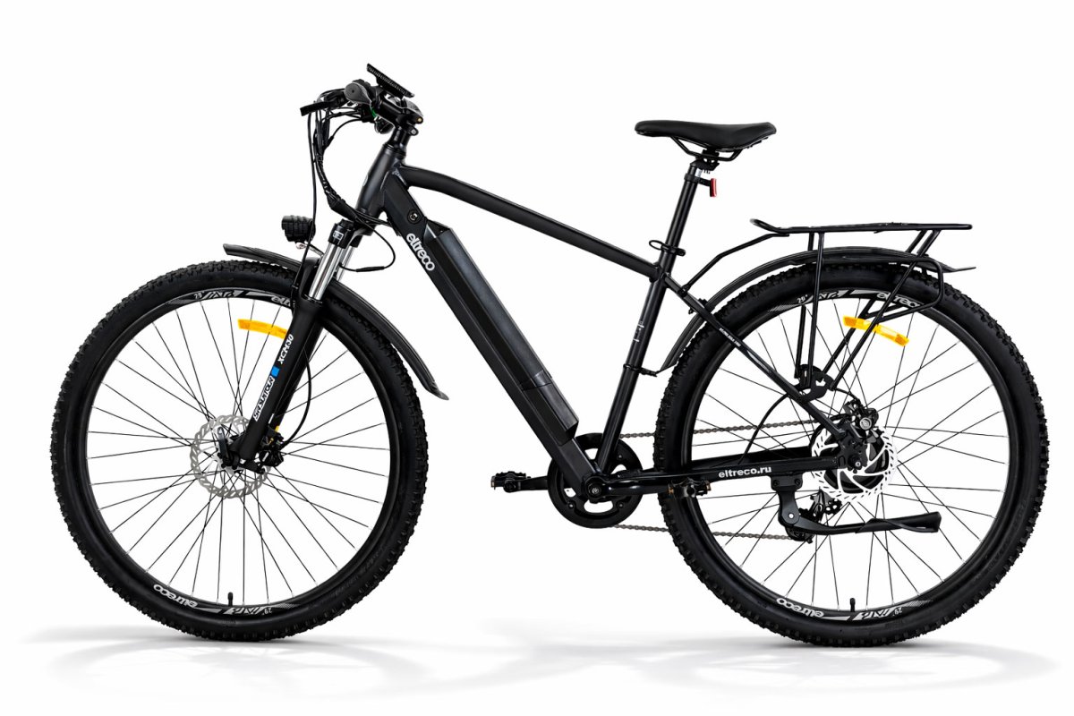 У новой топовой модели от Eltreco лёгкая алюминиевая рама с интегрированной съёмной батареей (улучшенная развесовка по сравнению со старой моделью), большие колёса 29" и покрышки Kenda с универсальным протектором, 21 скорость от Shimano, пружинно-эластомерные амортизационная вилка с блокировкой, надёжный электромотор 500 Ватт и максимальная ёмкость аккумуляторной батареи, позволяющих преодолевать большие расстояния без подзарядки! В комплектацию модели входят крылья и прочный металлический задний багажник.